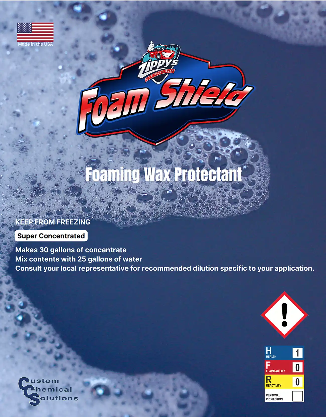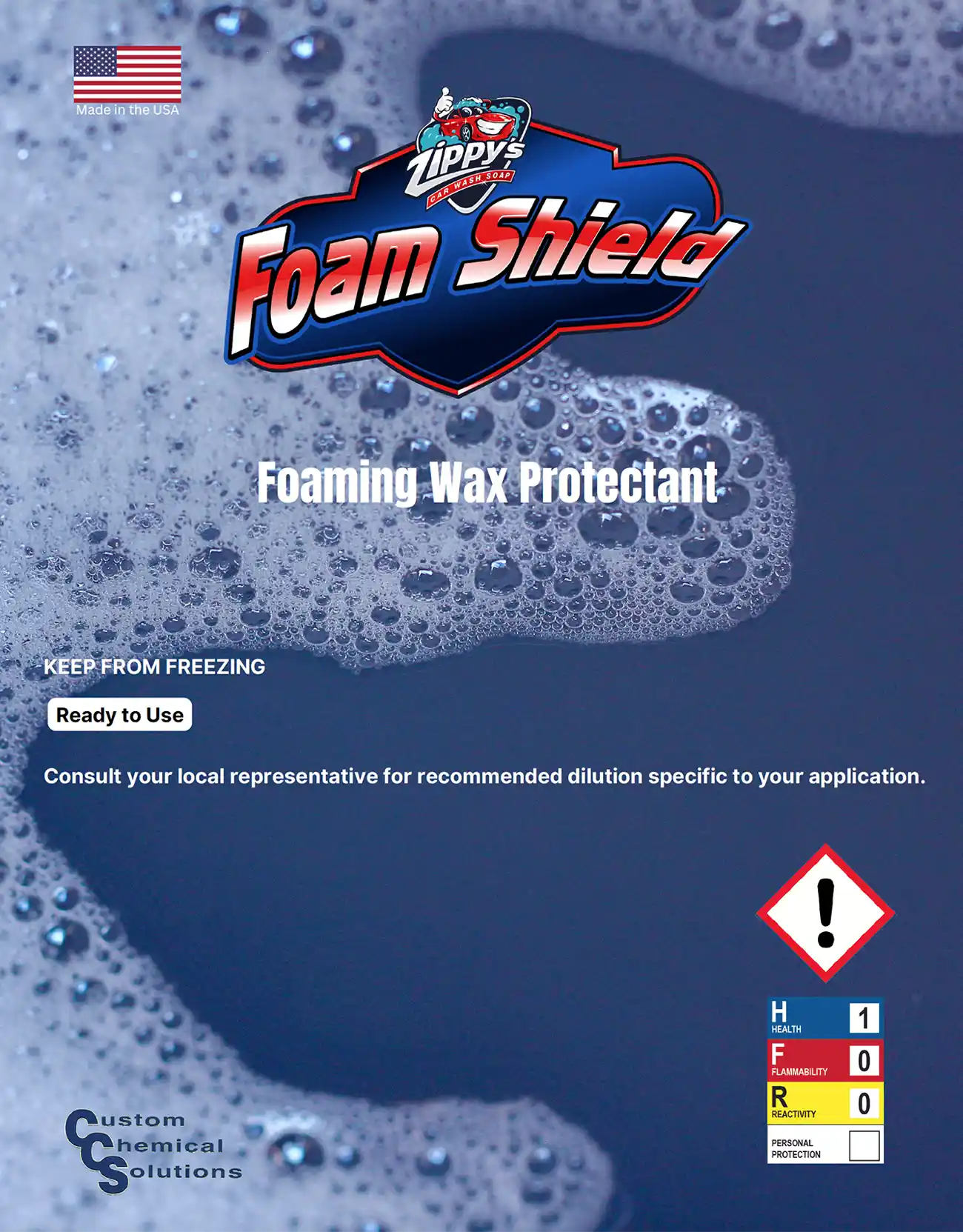 A specially designed professional product that creates an ultra-dense foam with a very high sheer strength which produces unprecedented sheeting. The products polymer system within will bond to the vehicle surfaces providing extended shine, protection, and water repellant qualities. This product should be applied with a proper “sheeting” or “wax bar” to produce a totally encompassing “sheet” of foaming wax. Foam Shield can be used in automatic or tunnel locations. With additional “accent” lighting, this product produces the wow factor customers will remember.