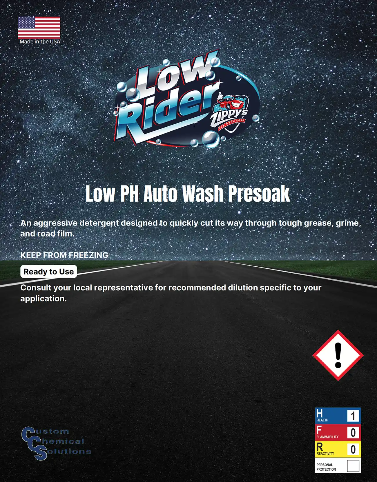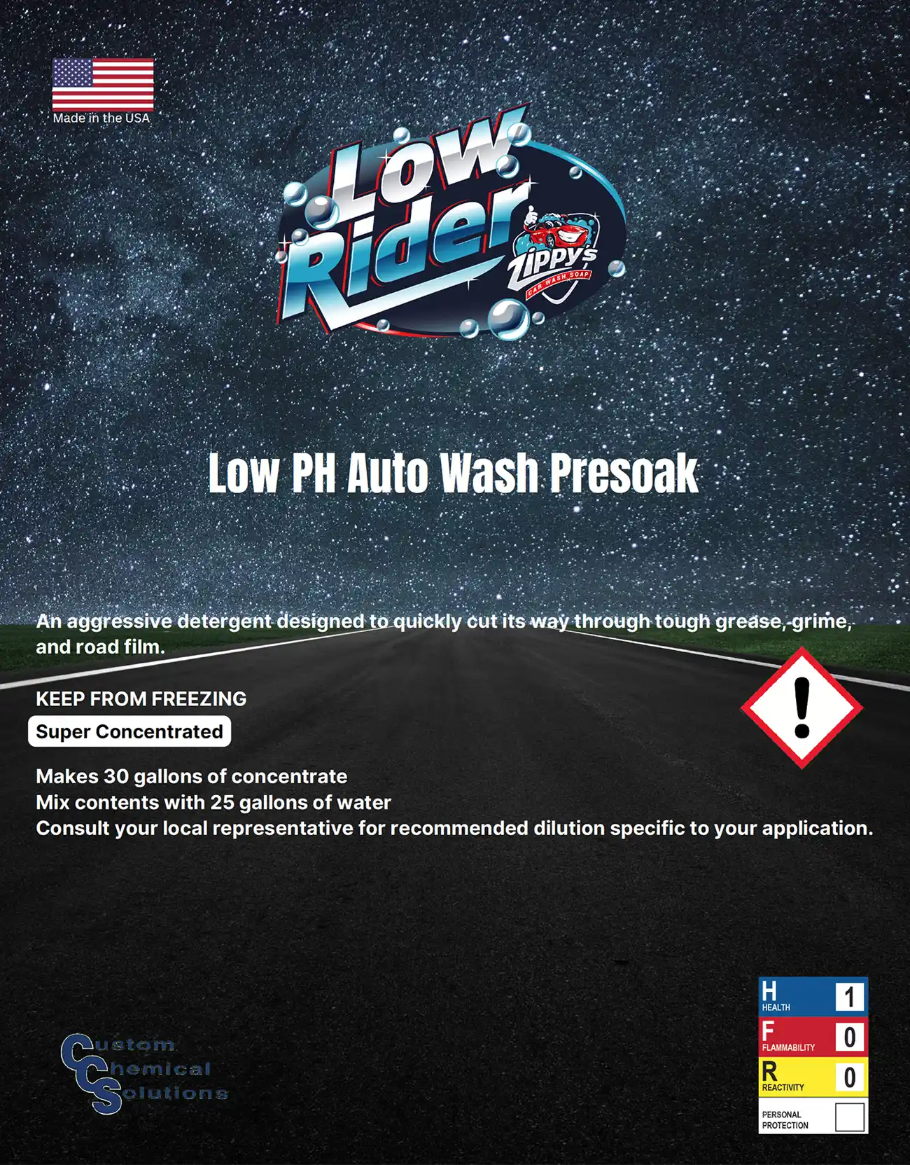 A first step pre-soak designed for automatic and tunnel washes with 2-step pre-soak capabilities. Zippy’s Car Wash Soap Low Rider first step pre-soak is designed to be used as the first step of the 2-step pre-soak process. This aggressive product delivers fantastic foaming action and provides lubricity for friction-based automatics while containing NO hydrofluoric acids. Low Rider provides the cleaning abilities to better remove road film from glass and remove brake dust and other oxide films present on the car without any harmful side effects of similar products containing harsh hydrofluoric acids. When combined with Zippy’s Car Wash Soap product Firestorm, these products produce an unmatched clean vehicle and great value.